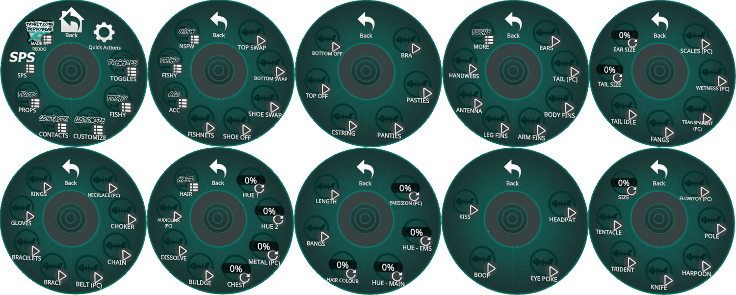 Ears | Tail* | Body fins | Arm fins | Leg fins | Antenna | Hand webs | Scales* | Wet skin* | Transparency* | Fangs | Tail idle animation | Tail size (radial) | Ear size (radial)