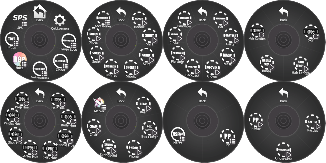 Chest size | Genderswap | Skin (radial, 3 tones on quest) | Hair (radial, 4 colours)