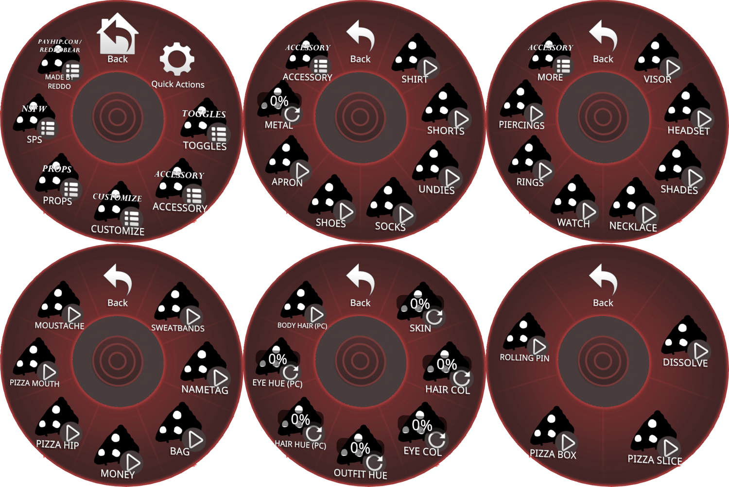 Visor | Headset | Shades | Necklace | Watch | Rings | Piercings | Armbands | Nametag | Money | Pizza mouth | Pizza hip
